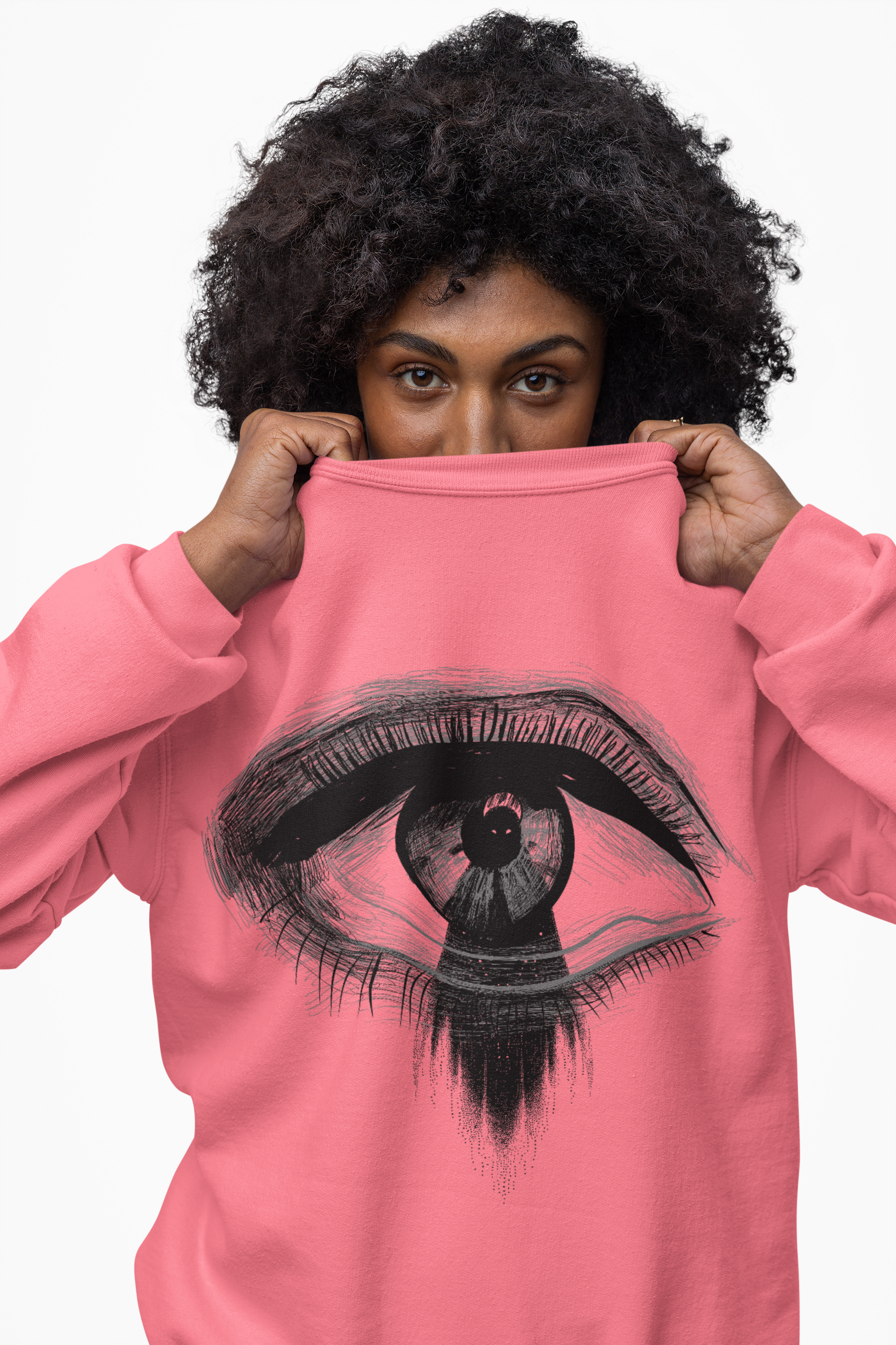 Not all visions are meant for human eyes. This sweatshirt unveils a hauntingly surreal design - a piercing human eye, fixated on ghoul that seems to be bleeding out from within. A chilling reminder that there's more to this world than meets the eye.